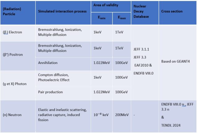 Tableau récapitulatif des rayonnement inclus dans RayXpert, des interactions simulées, des aires de validité par rayonnement, et des bases de données disponibles dans RayXpert.